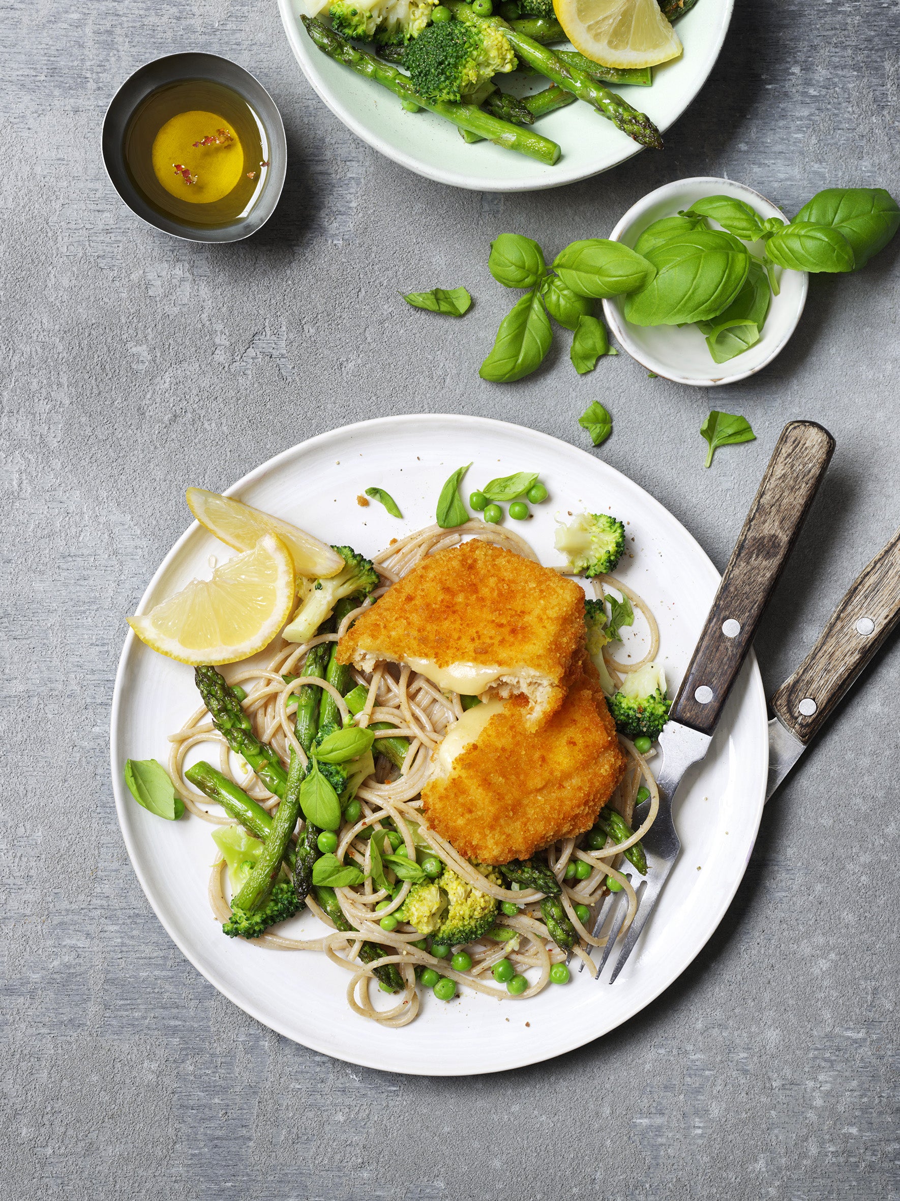 Probiere unser köstliches vegetarisches Käse-Schnitzel von Garden Gourmet mit Nudeln und Spargel. Leicht, knusprig und lecker!