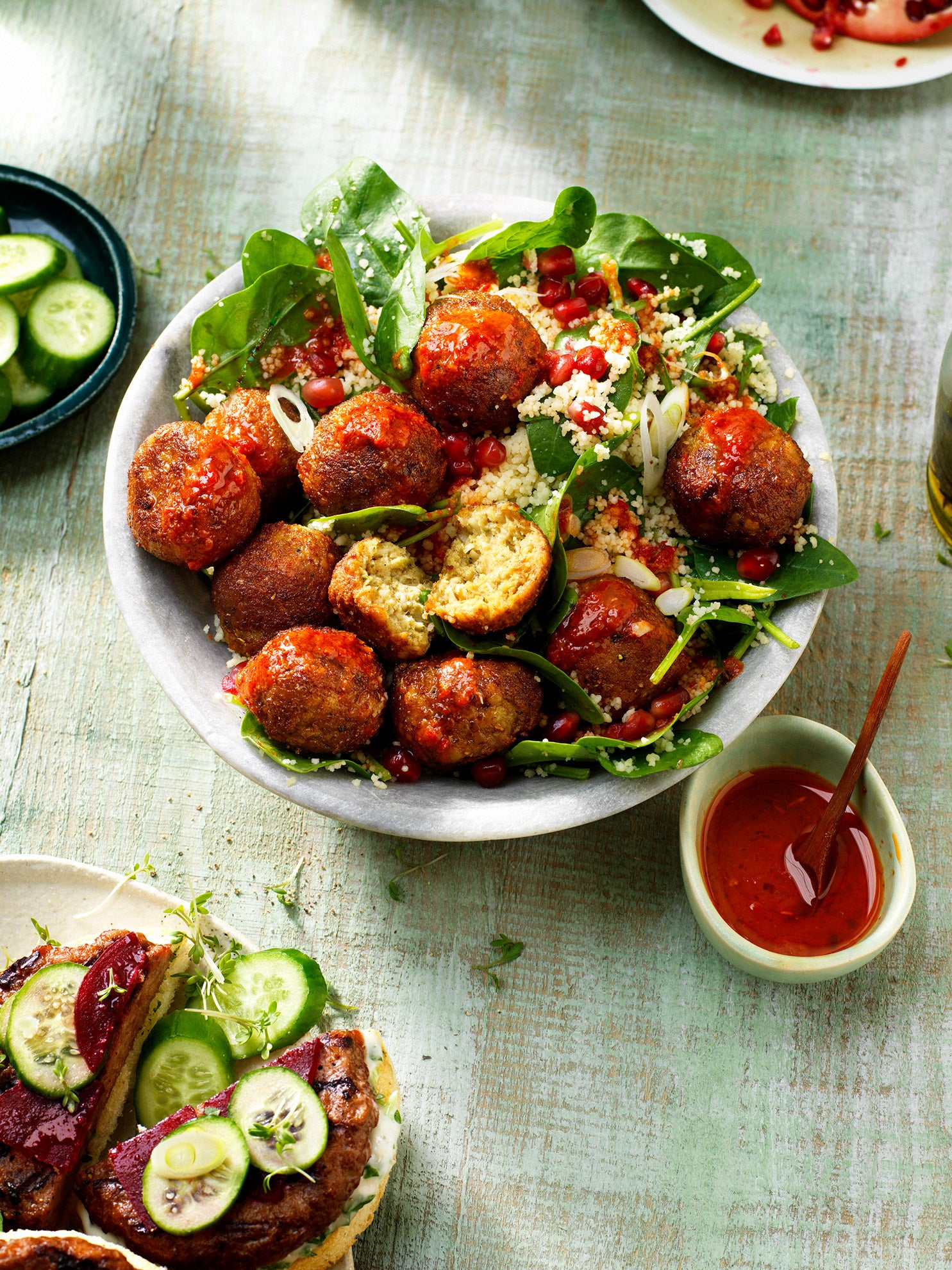 Fais dorer les boulettes de falafel selon les instructions sur l'emballage. Verse la salade dans un bol. Répartis les falafels sur le dessus et arrose de vinaigrette. Garnis en plus d'oignons de printemps émincés et de menthe.