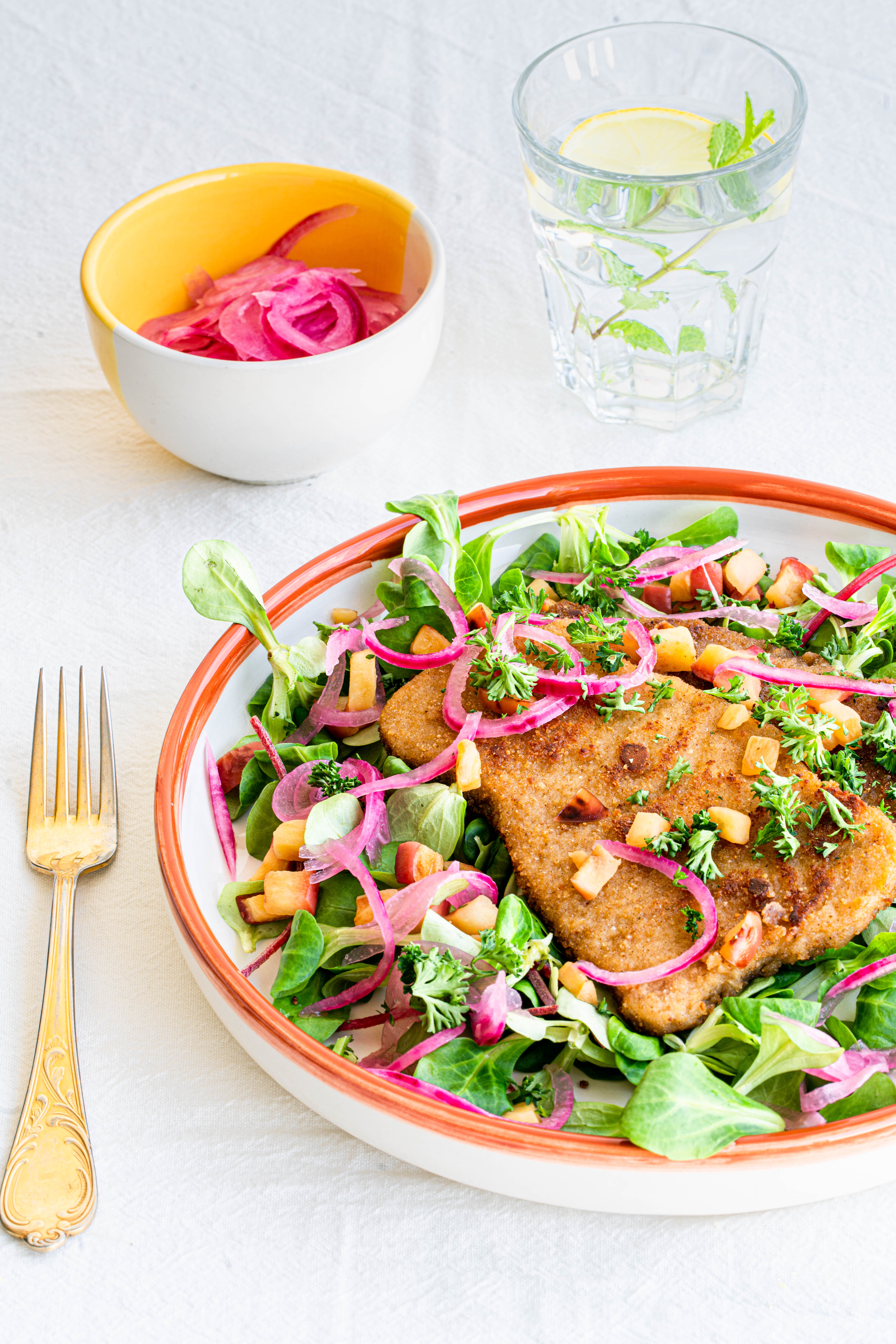 Répartis la mâche sur l'assiette puis dépose les Cheese Schnitzels. Termine avec l'oignon rouge mariné, les pommes au four et le persil. Déguste !